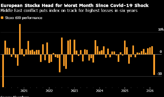 斯托克欧洲600指数收盘下落1%,收窄了本周幽微涨幅。该基准指数本月跌幅展望将达9.2%,这将是自2020年新冠疫情冲击民众经济以来最大的月度跌幅。